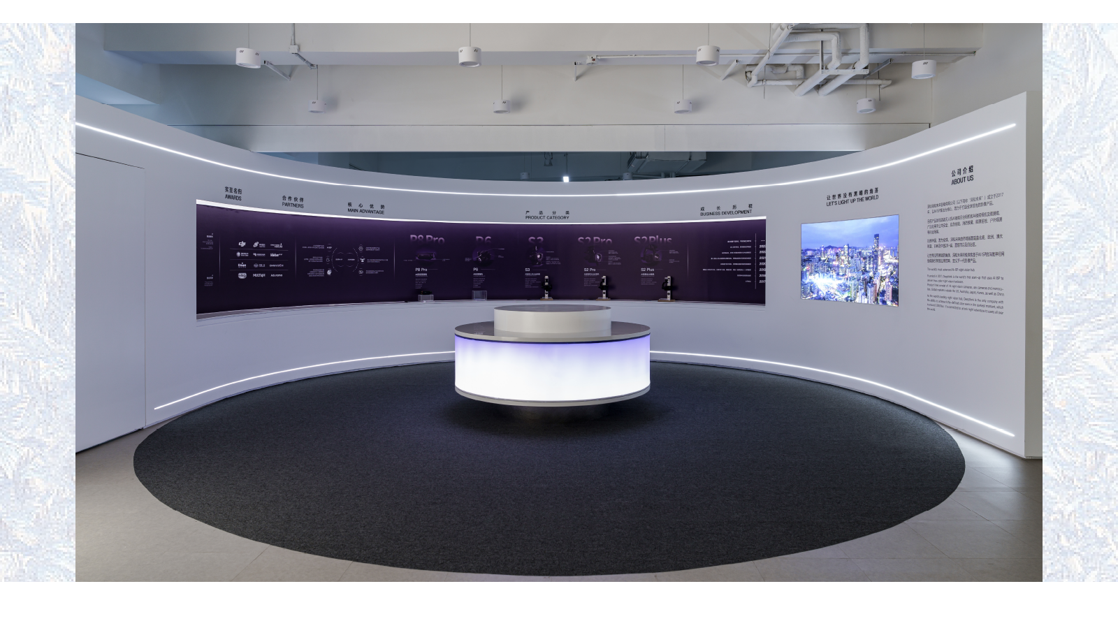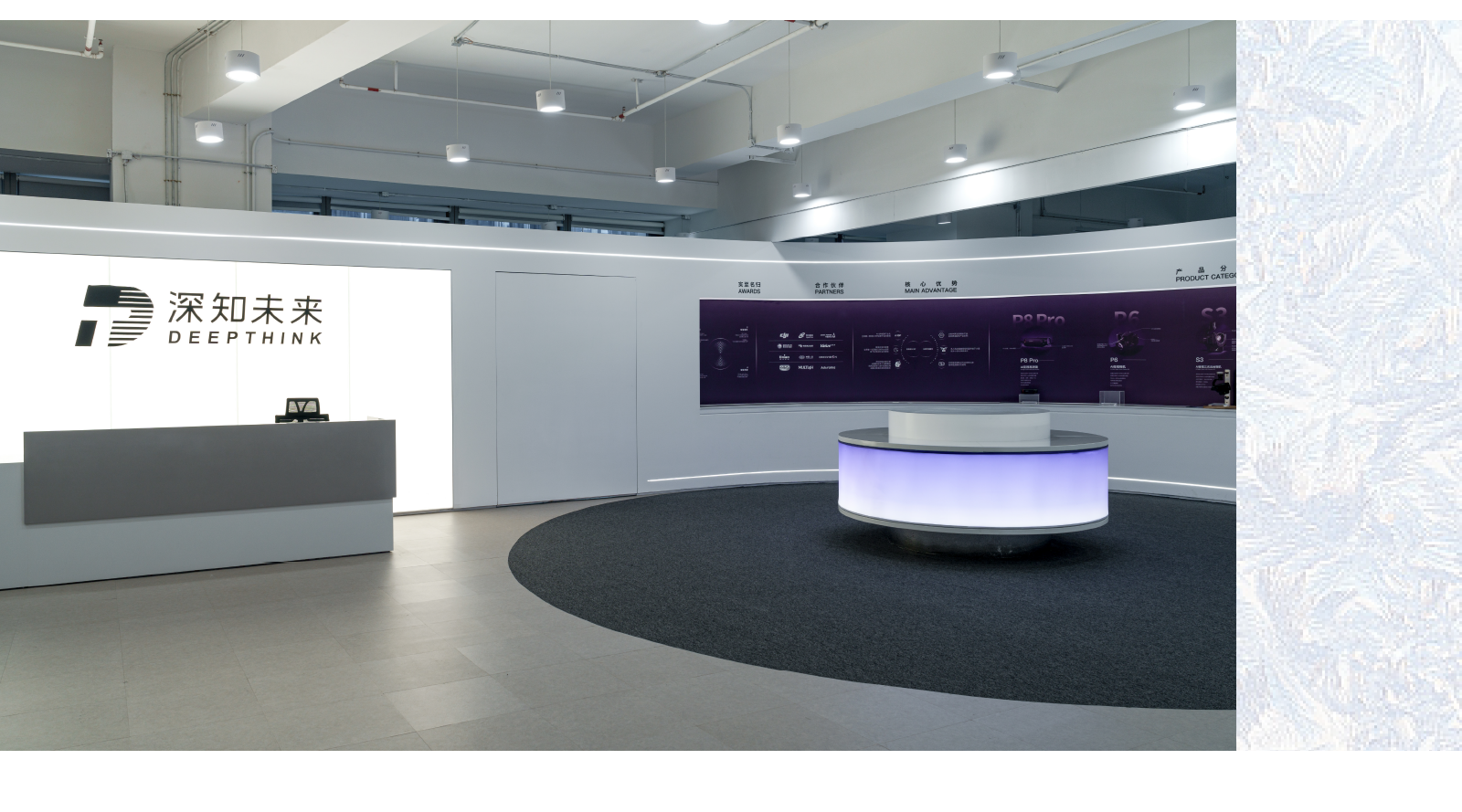 When designing this office exhibition hall, we fully grasped the brand essence and technological characteristics of "DEEPTHINK". With white and purple as the main color scheme, we seamlessly integrated a futuristic aesthetic with artistic elements to showcase the allure of smart technology.